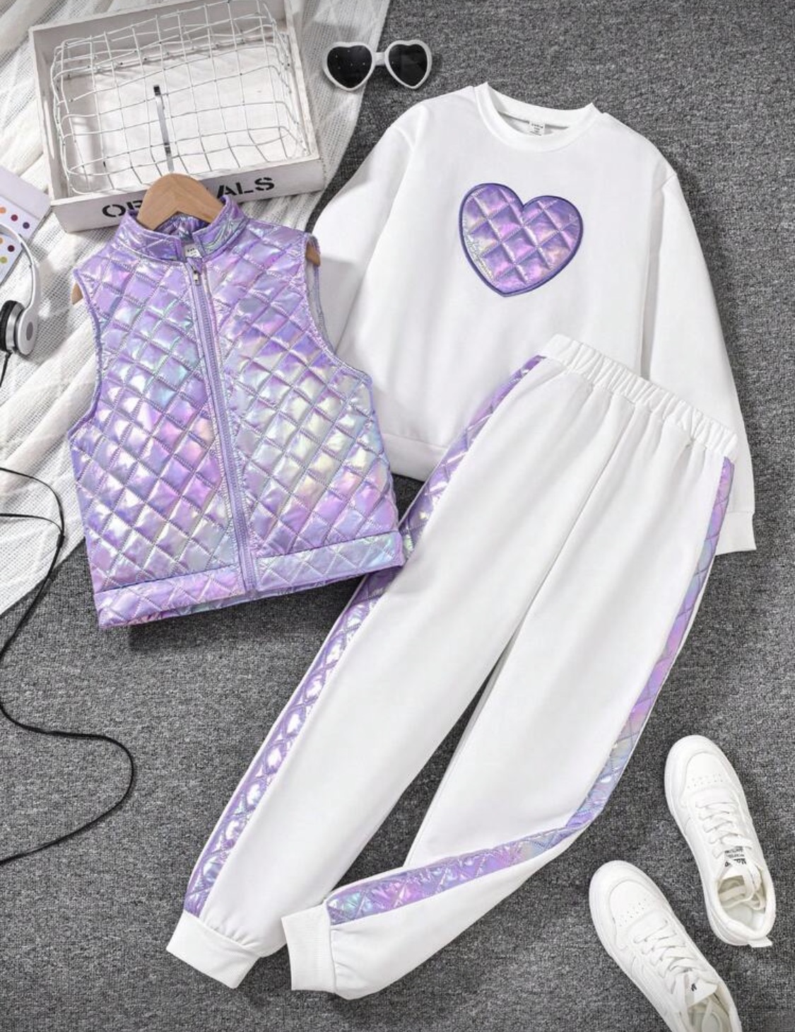 ست سه تیکه دخترانه از برند shein. بلوز و شلوار و وست هولوگرامی. مناسب دمای ۱۰ تا ۱۷ درجه. دارای کشسانی کم. جدول سایز هر سه تیکه به طور جداگانه براتون گذاشته شده.